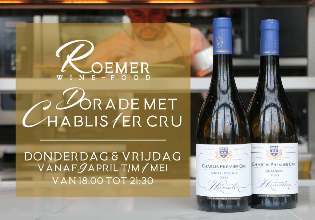 Daar schenken we Chablis Premier Cru van Domaine Hamelin bij. Deze Chardonnay uit het noorden van Bourgogne staat bekend om zijn pure stijl: strak, mineraal en levendig fris. perfect voor de delicate smaak van dorade en het frisse karakter van de citroenrisotto.